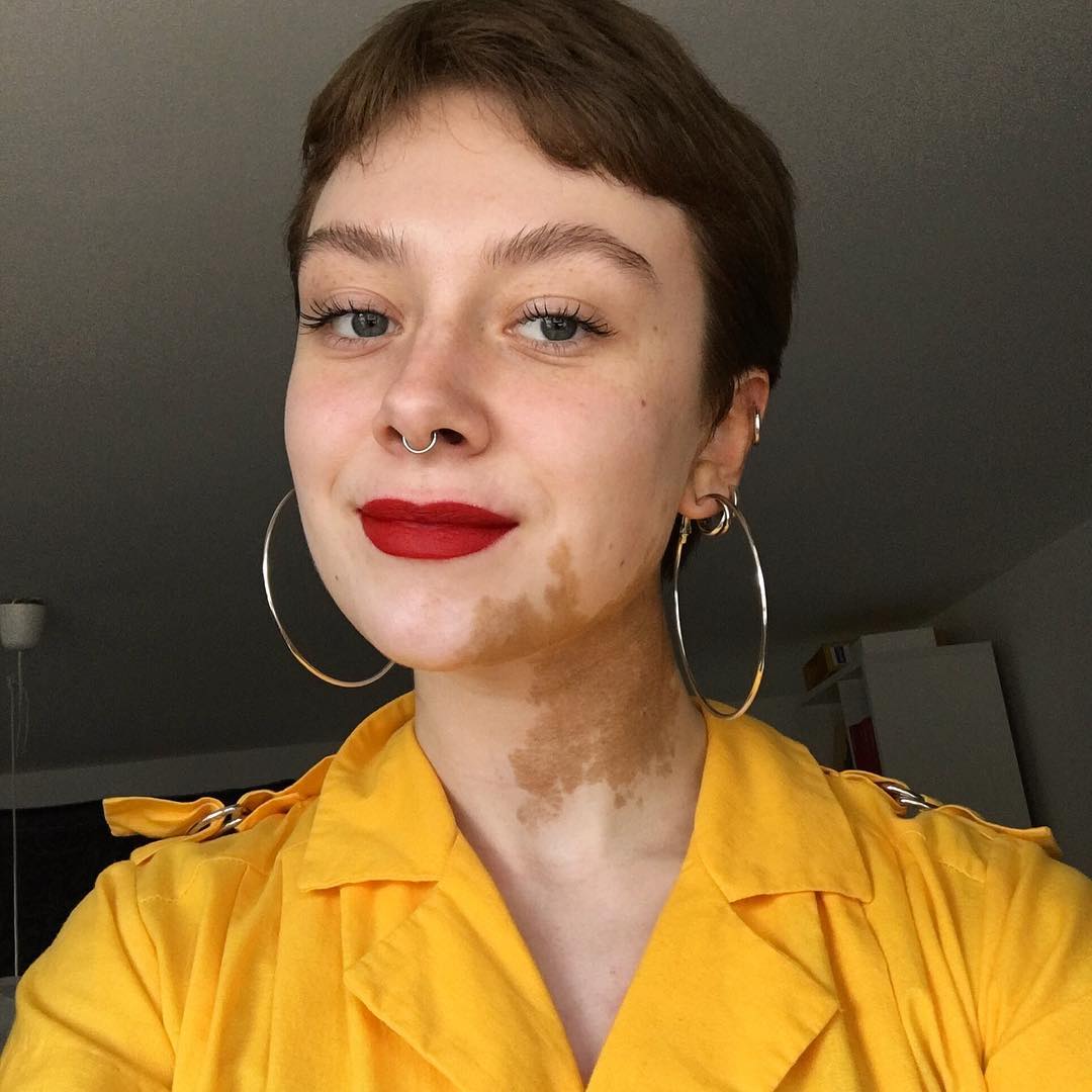 Em vez de esconder, Olivia Holm Poulsen escolheu destacar sua mancha com cores e muito brilho
