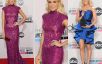 A cantora Carrie Underwood escolheu um longo violeta com cauda e gola da grife Abed Mahfouz! Depois do show, ela trocou a peça por um vestido curtinho azul klein com muitos babados na saia.