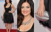 Lucy Hale optou por uma produção básica e linda: vestido pretinho ladylike, combinado com maxicolar, escarpim vermelho e clutch prata em formato de boquinha. Girlie!