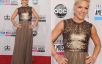 P!nk escolheu um vestido longo bronze com recortes sofisticados na parte de cima e saia fluida. A cintura marcada ajuda a alongar a silhueta!