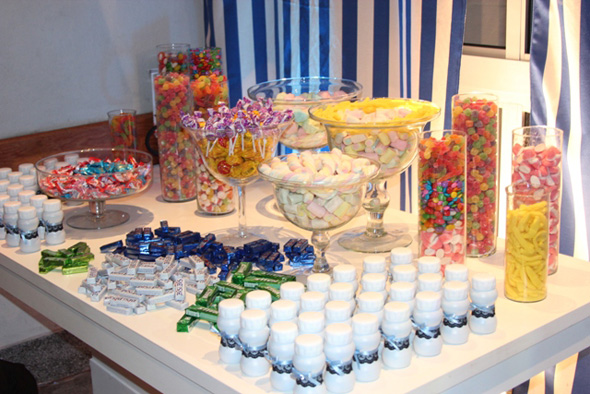 Para combinar com o tema, a Lara escolheu as cores azul preto e branco para compor a decoração. Ficou luxo, né?