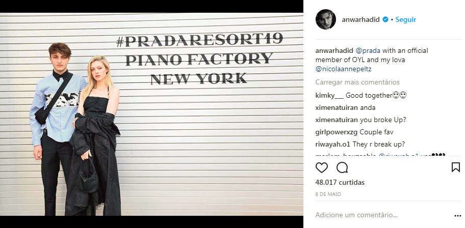 Anwar, por outro lado, namorou a atriz Nicola Peltz por mais de um ano. Ainda segundo o TMZ, o relacionamento entre os dois acabou há cerca de mês. No Instagram, a última foto que o irmão de Gigi e Bella compartilhou com a ex-namorada é do dia 8 maio.