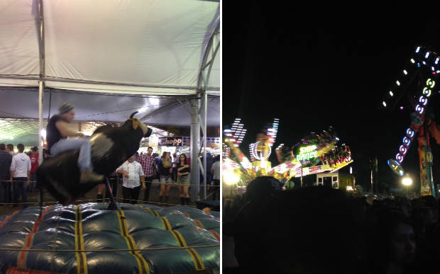 Quando chegamos, estava rolando na arena o rodeio em si, com aquelas provas de ficar em cima do touro ou do cavalo. Como eu acho meio cruel com os bichinhos, fui dar uma volta e ver o que mais tinha para fazer. O tamanho do evento é impressionante! A festa acontece em um parque de eventos no meio da estrada e, além de ter a maior arena da América Latina, conta com uma arquibancada gigante, um camarote VIP, um espaço enorme para barraquinhas de comida e food trucks (sim, essa febre chegou por lá também) e até um parque de diversões!