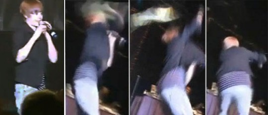 Agora foi durante um show promocional de uma rádio. Enquanto ele conversava com o público, alguém arremessou uma garrafa (ou algo muito parecido com isso) na cabeça dele! OMG! Tadinho de Justin, parece que machucou! Vejam: