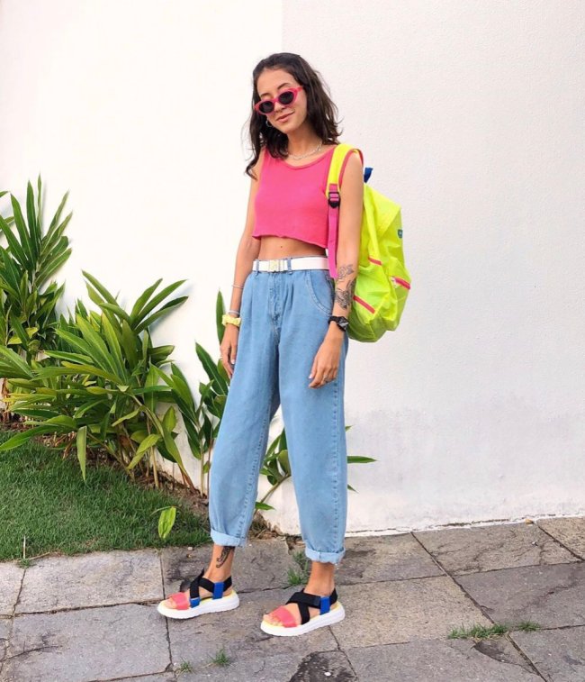Camiseta, calça baggy, papete e mochila formam um visual prático e bem fashionista para deixar o dia a dia mais colorido e estiloso.