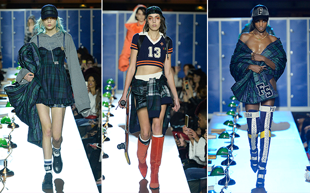 Rolaram também números estampados, em referência aos uniformes de futebol americano, e sobreposições fofas com camisa polo. Ah, as meias 7/8 deixavam os looks ainda mais especiais.