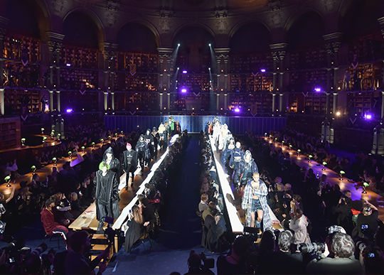 O desfile aconteceu na Biblioteca Nacional da França e a passarela, na verdade, eram as mesas de estudo do local. Ao fundo, vários armários de high schools americanos compunham o cenário.