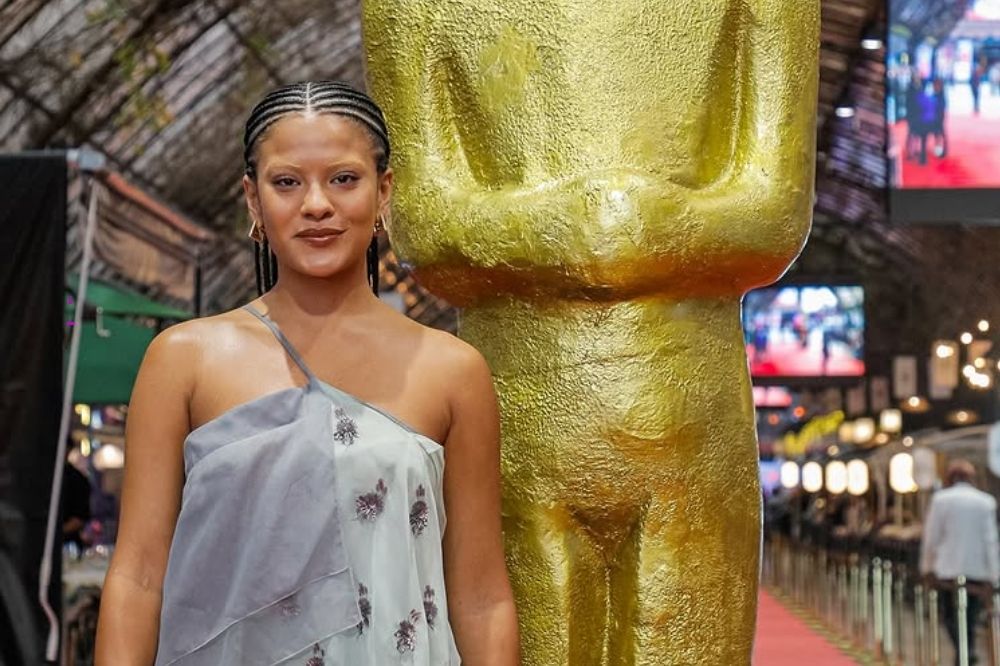 Bella Campos causou impacto na estreia de ‘Cinco Tipos de Medo’ no 53º Festival de Cinema de Gramado. A atriz surgiu em uma versão bem diferente da que o público está acostumado a ver na novela ‘Vale Tudo’. Com tranças nagô, sobrancelhas descoloridas e uma produção ousada, ela escolheu um look da coleção Primavera/Verão 2025 da Fendi: vestido de seda claro bordado em azul, usado sobre uma calça ampla cinza. O visual foi finalizado com brincos dourados e a icônica bolsa Mama Baguette Beige, também da grife italiana.