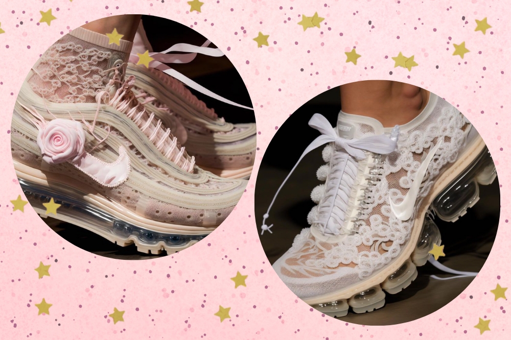Os modelos escolhidos foram o Air Force 1 e o Vapormax, criados pelo perfil do Instagram @AI_ClothingDaily, que desenvolve peças a partir da inteligência artificial. O que chamou a atenção foram os detalhes em renda muito realistas inseridos nos calçados, conferindo a eles uma estética meio balletcore e também uma vibe look de noiva – com certeza poderiam fazer parte de uma colaboração com a estilista irlandesa Simone Rocha.