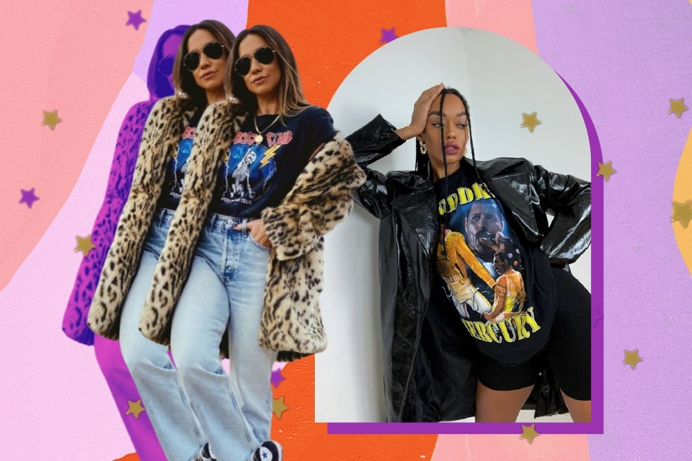 Seja jeans ou de alfaiataria, a camiseta de banda é tão versátil que funciona bem com todos os tipos de calça. Você pode ousar com uma peça de animal print e investir em acessórios como colares, boinas e correntes.