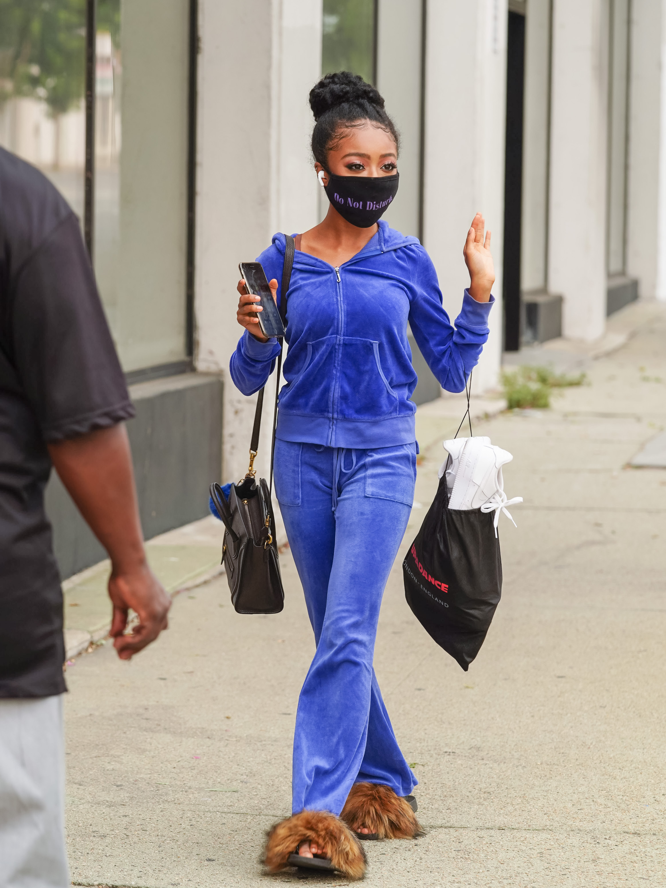 Produção confortável? Temos! Skai Jackson apostou em um conjuntinho de plush todo azul que é a cara dos anos 2000. Na época, essa tendência bombava entre famosas como Lindsay Lohan e Britney Spears. Para finalizar o visual, a atriz escolheu um chinelo slide de pelinhos e uma bolsinha preta bem prática para o dia a dia. O que você acha do conjuntinho? Usaria?