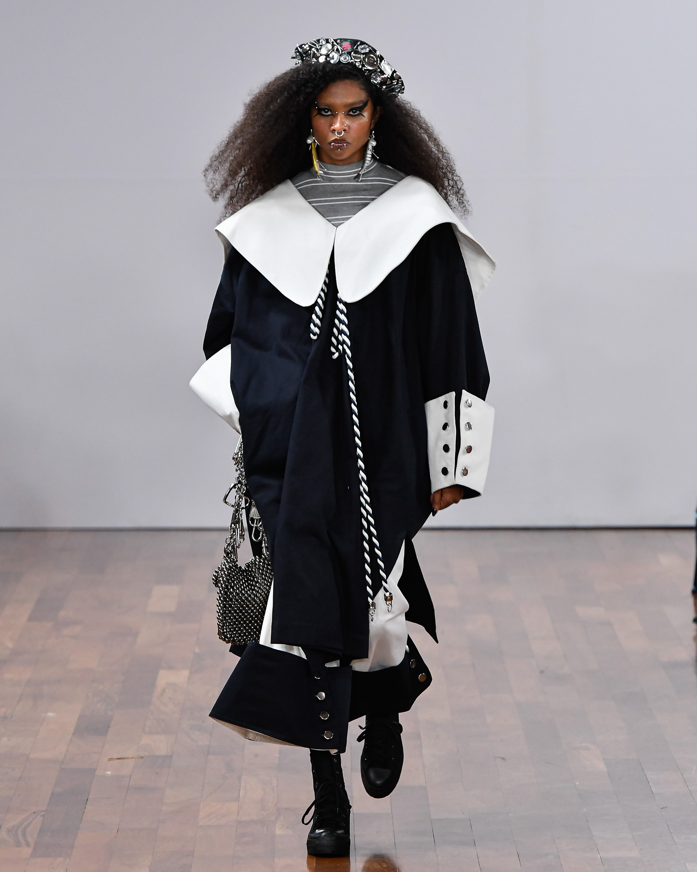 Patches, estampa de tatuagem, peças plissadas, tons metalizados, tecidos laminados, golas exageradas, crochê, tricô, colares com conchas e piercings… Essa mistura de materiais ajuda a construir a narrativa da coleção, que fica completa com escolhas que já fazem parte do universo da marca, como a silhueta oversized, o xadrez, os cintos de ilhós e os bolsos utilitários, por exemplo.