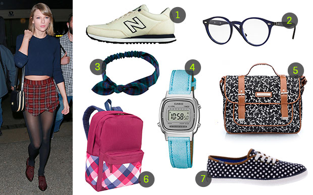 Preppy como a Taylor Swift : o xadrez e o azul marinho trazem o charme dos uniformes antigos. Bolsa pasta e faixa com lacinho são o mix perfeito da cantora com a Blair Waldorf, de Gossip Girl !