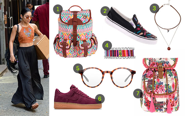 Boho como a Vanessa Hudgens : louca por looks de festival com inspiração 70’s ? Então, essas escolhas têm tudo a ver com você. Estampa étnica, bijus coloridas e óculos redondinho!